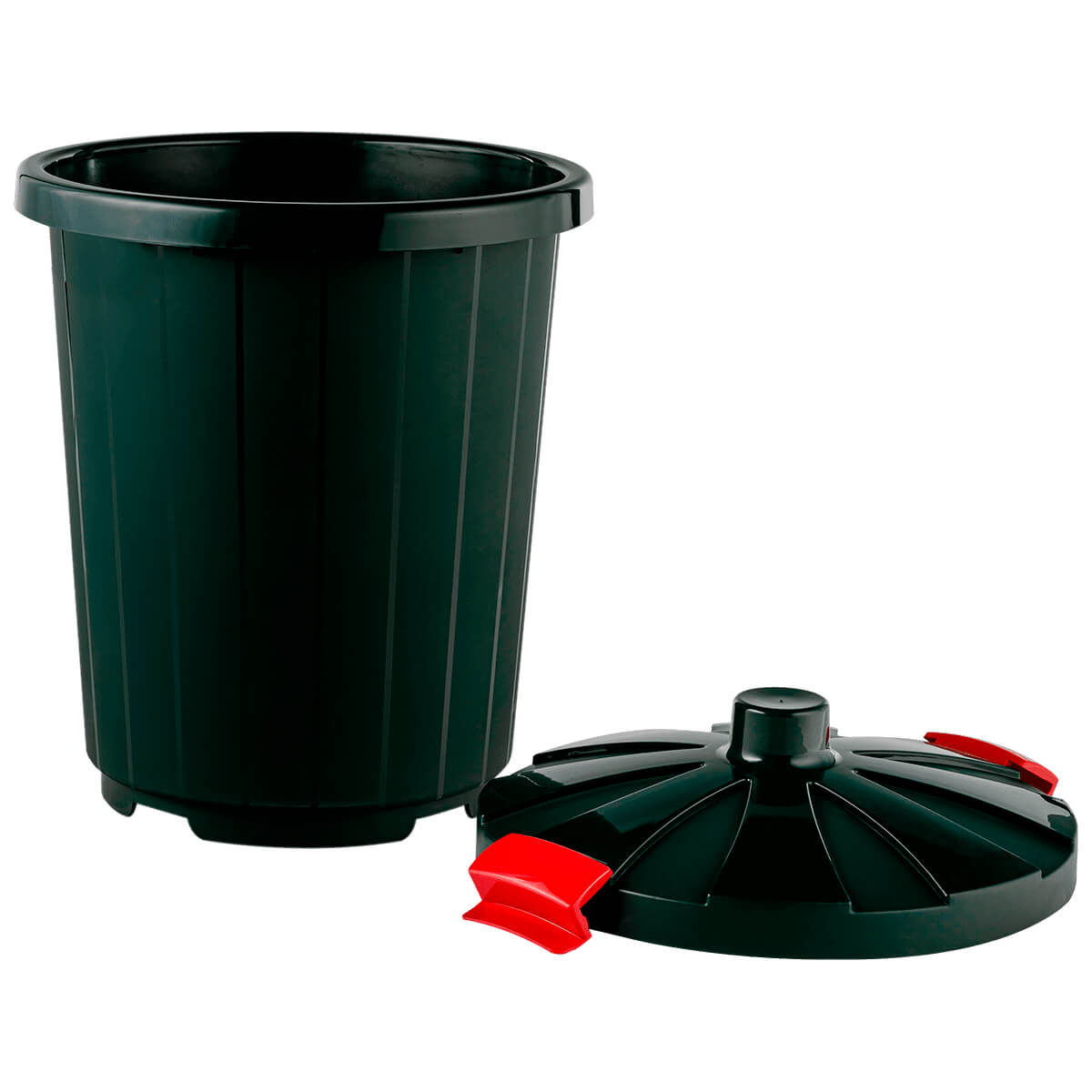 Надежная крышка с защелками обеспечивает фиксацию содержимого и защиту от воздействия животных и насекомых. Темно-зеленый цвет добавляет акцент свежести и стиля в окружающую среду. Ребристая внешняя поверхность облегчает перемещение, а гладкие внутренние стенки упрощают процесс очистки и дезинфекции.
